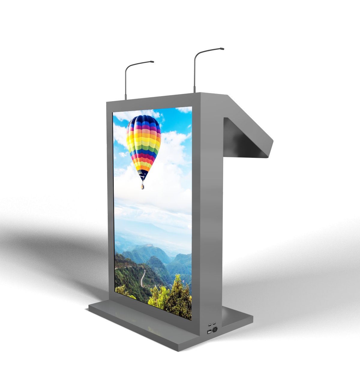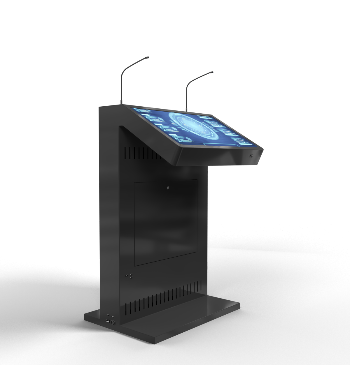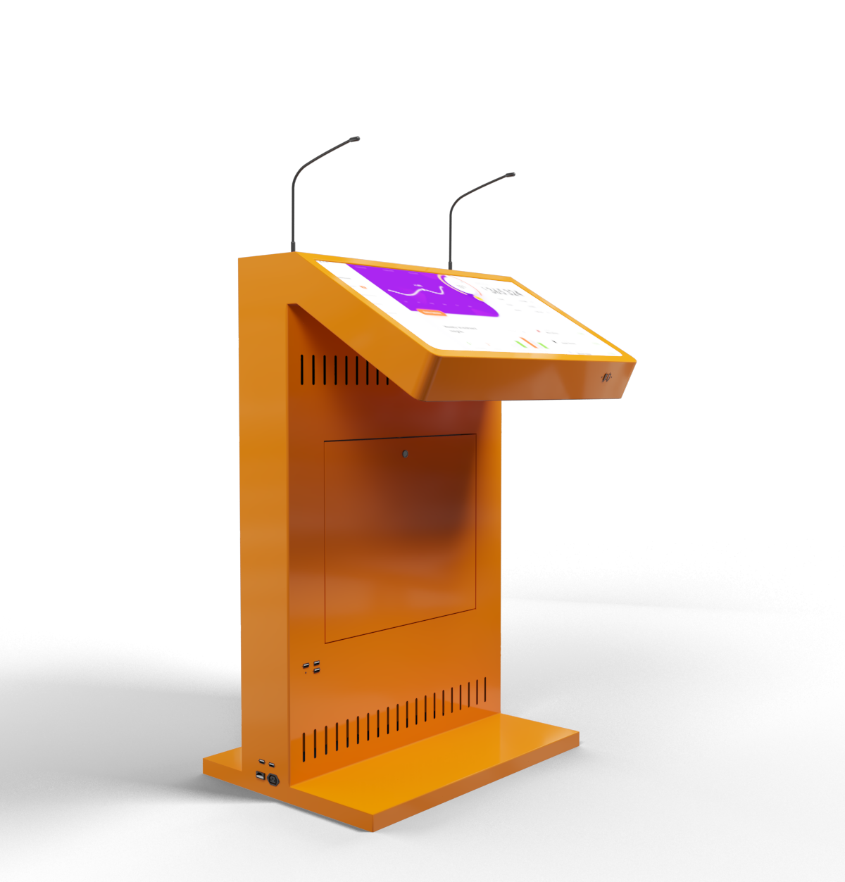 Мы разработали особую модель интерактивной трибуны – с большим внешним дисплеем, на котором можно демонстрировать ролики, презентации, логотипы спонсоров и т.д. Трибуна оснащена двумя микрофонами, сенсорным дисплеем для спикера и набором разъемов для подключения дополнительной аппаратуры.