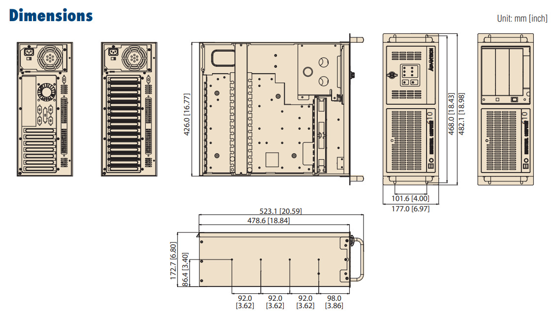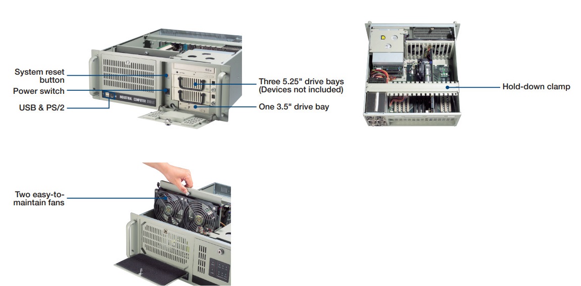 Промышленный компьютерный корпус IPC-610MB-00HD, монтаж в 19" стойку, 4U, 1 х внешний 3.5", 3 х внешних 5.25", 2 х USB 2.0, 1 х PS/2, без PSU (62368)