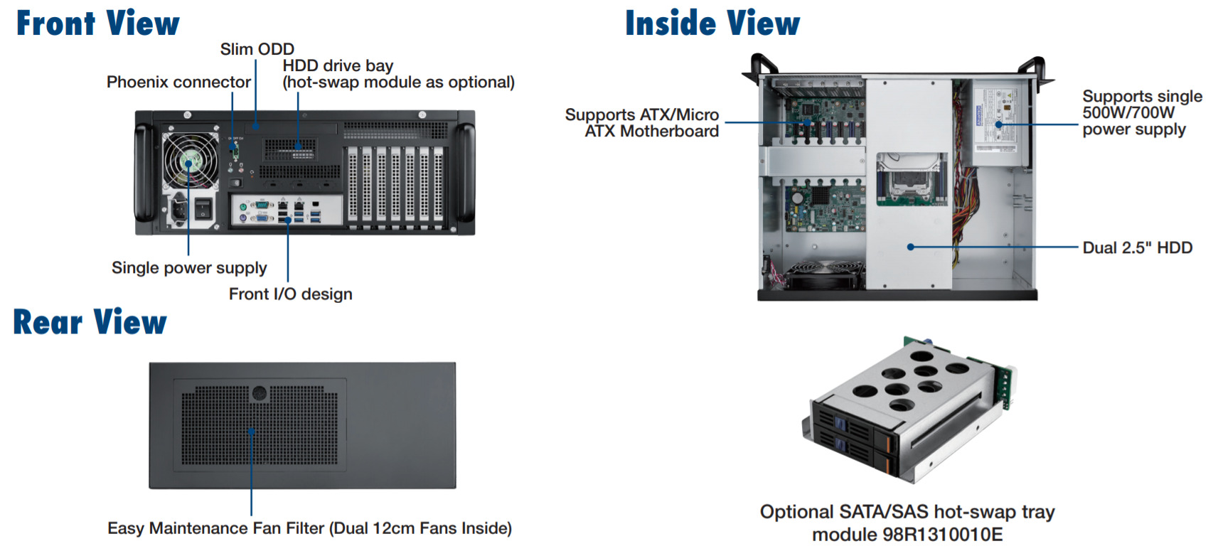 Корпус IPC-631MB-50B, 4U, ATX/MicroATX, монтаж в 19" стойку, 1 х Slim ODD, 2 х 2.5" HDD с возможностью "горячей замены" (опция), 2 х внутренний 2.5" HDD, 3 х COM, PS8-500ATX-BB, 0....+40 °C