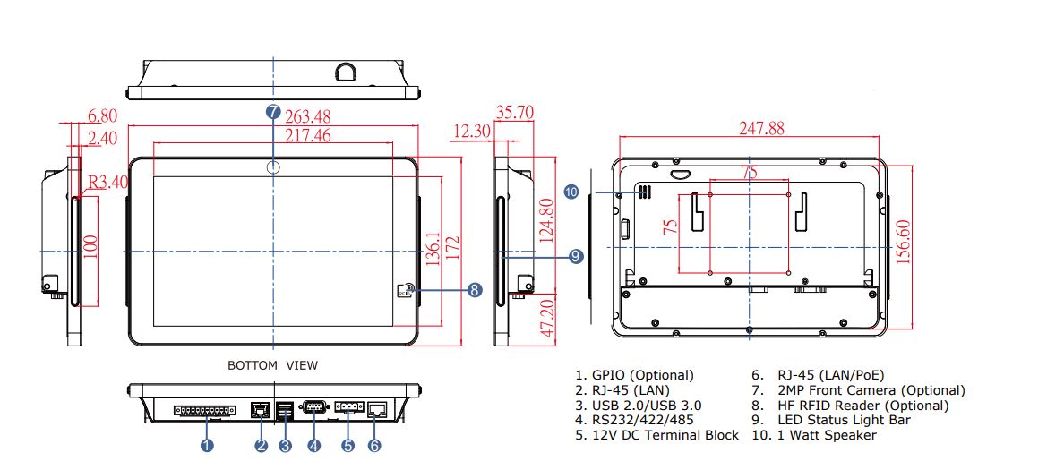 Панельный компьютер W10IB3S-PCH2AC-PoE, процессор Intel® Celeron® N2930 1.83ГГц, DDR3: 2ГБ, Storage: 64ГБ, OС: есть, проекционно-ёмкотный экран, POE, световая панель с левой и правой сторон, кабель питания EURO