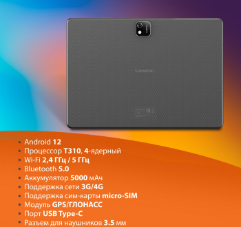 ГК «Навигатор», сетевой и системный интегратор, предлагает купить Планшет SunWind Sky 1264C 4G T310 (1.8) 4C RAM2Gb ROM32Gb 10.1" IPS 1280x800 4G 1Sim Android 12 темно-серый 2Mpix 2Mpix BT WiFi microSD 128Gb 5000mAh.