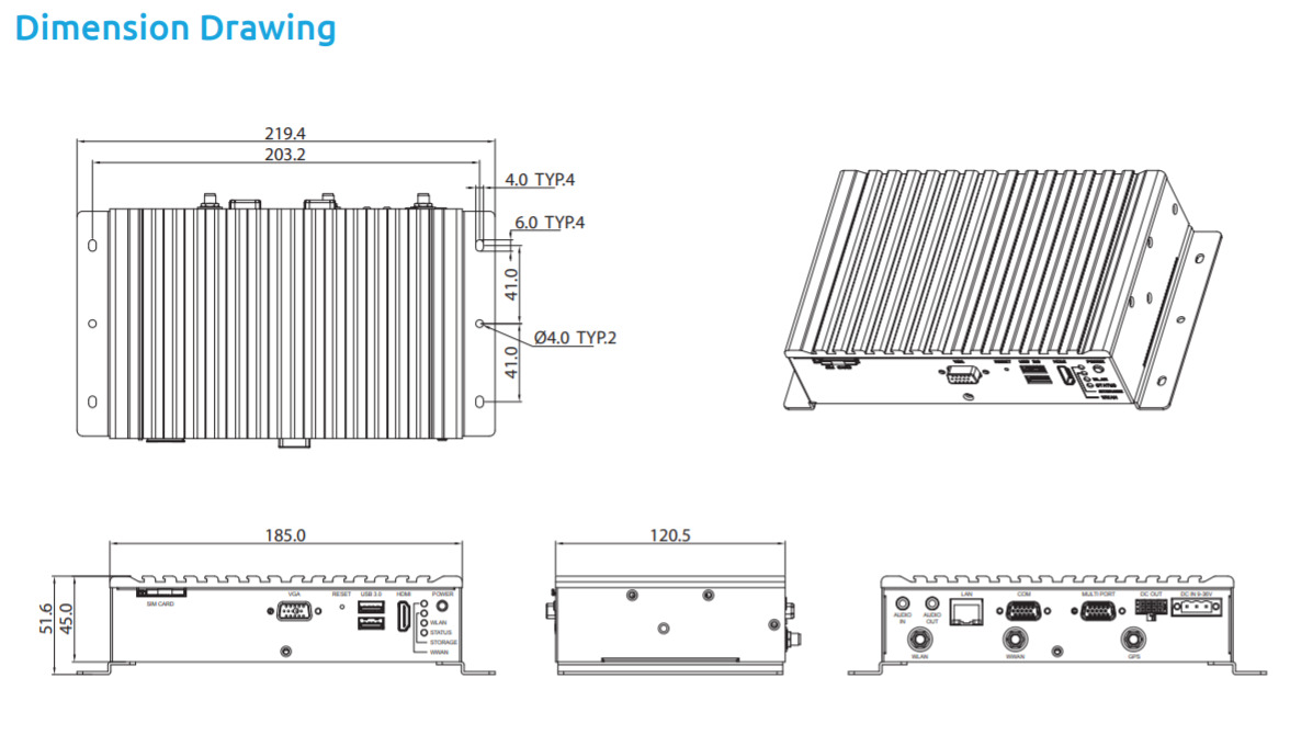 Компактный безвентиляторный компьютер VTC1020 для автотранспорта, процессор Intel Atom® x5-E3930, 1.3 ГГц, 4 Гб DDR3L, 1 x 2.5" SSD SATA 3.0 , 1 x mSATA, 1 х 10/100/1000(RJ45), 1 x DB-15 VGA, 1 x HDMI, 2 x тип A USB 3.0, 1 x DB9 COM для 4 x RS232 Tx/Rx, 2 x RS485, 1 x DB15 для 1 х CAN 2.0B, 1 x RS232 Tx/Rx, DIO, 2 x mini-PCIe, 1 x SIM , 1 x Audio-in, 1 x Audio-out, 1 x u-blox NEO-M8N модуль (с поддержкой GPS/Gloness/QZSS/Galileo/Beidou), 3 х Антена (WWAN/WLAN/GPS), 9~36 В DC